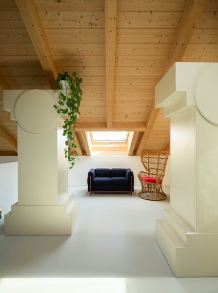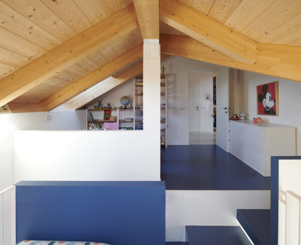 E poi i dettagli che fanno la differenza: colori forti e vivaci nelle camere dei piccoli, che diventano luoghi per crescere, immaginare e sognare. Geometrie nere e bianche nei bagni, bilanciate da specchi dalle forme irregolari e da colori accesi e elettrici che aggiungono un pizzico di ironia e rendono tutto più divertente. Legno caldo ovunque, a ricordare le radici storiche della casa. I pilastri-scultura nel sottotetto, che trasformano un vincolo in un omaggio architettonico teatrale! E infine tanta luce naturale, protagonista assoluta, che entra, avvolge e cambia mood a seconda delle ore del giorno.