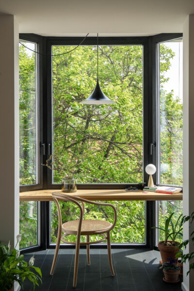 Al posto del balcone originario, un’idea molto poetica e romantica: un bow-window che sporge verso il giardino, come un piccolo osservatorio domestico. Qui ci si siede a leggere, a lavorare, a guardare fuori quell’albero di cachi. Uno spazio che sembra isolato, eppure resta fluido, in continuità con tutto il resto.