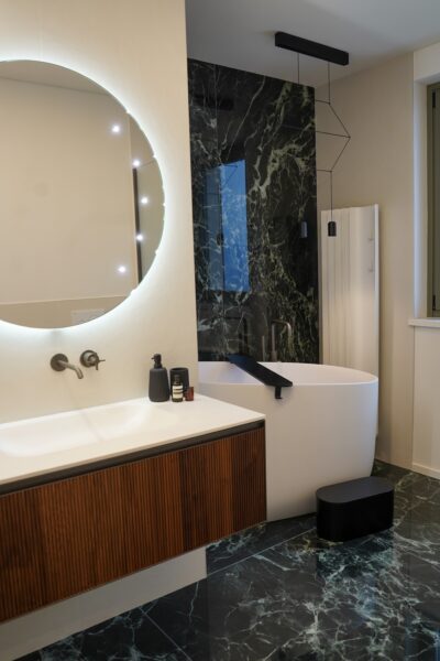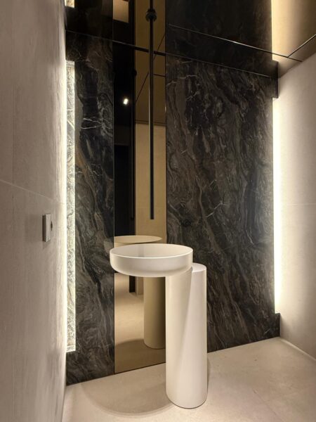 C’è una cosa che mi ha colpita più di tutte: l’ulivo posto al centro dell’ingresso attorno al quale si sviluppa il resto dell’ambiente. Inserito in una vasca in acciaio realizzata su misura, questo ulivo è stato fortemente voluto dal cliente per portare dentro casa il verde circostante.