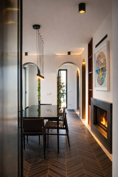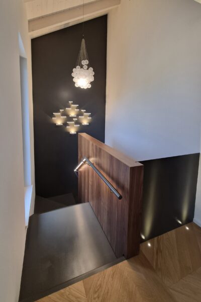 La contemporaneità si esprime, come nella maggior parte dei casi, negli interni: essenziali, luminosi e dichiaratamente di design. Senza appesantire però gli spazi contrastano l’esterno più classico, perfettamente amalgamato al paesaggio. Sono ambienti pensati per accompagnare lo sguardo verso le lunghe viste panoramiche: ogni affaccio qui è un quadro!