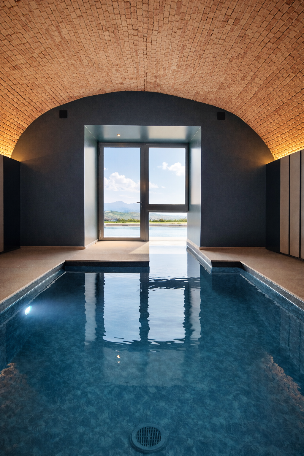 Non un semplice collegamento ma un percorso quasi segreto che trasforma lo spostamento in esperienza. È proprio lungo questo tragitto sotterraneo che si sviluppa la piscina riscaldata, affacciata su una grande vetrata scorrevole che mette in connessione interno ed esterno, creando uno spazio fluido e sorprendente.